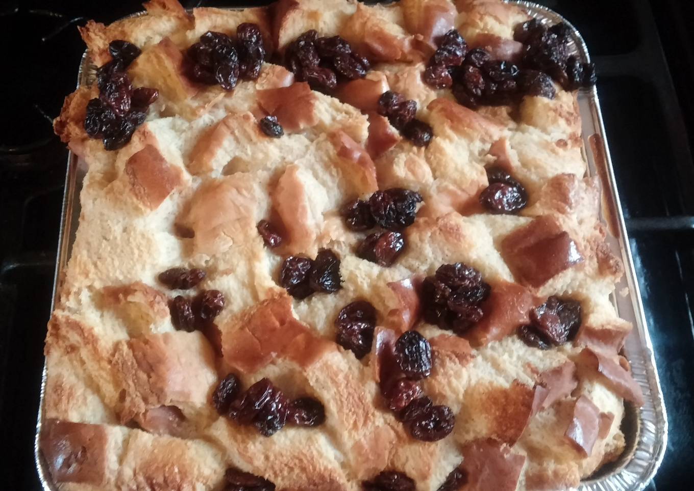 - Break bread into small pieces in an 8" square baking pan. Drizzle melted butter on top of bread and if desired garnish with raisins.