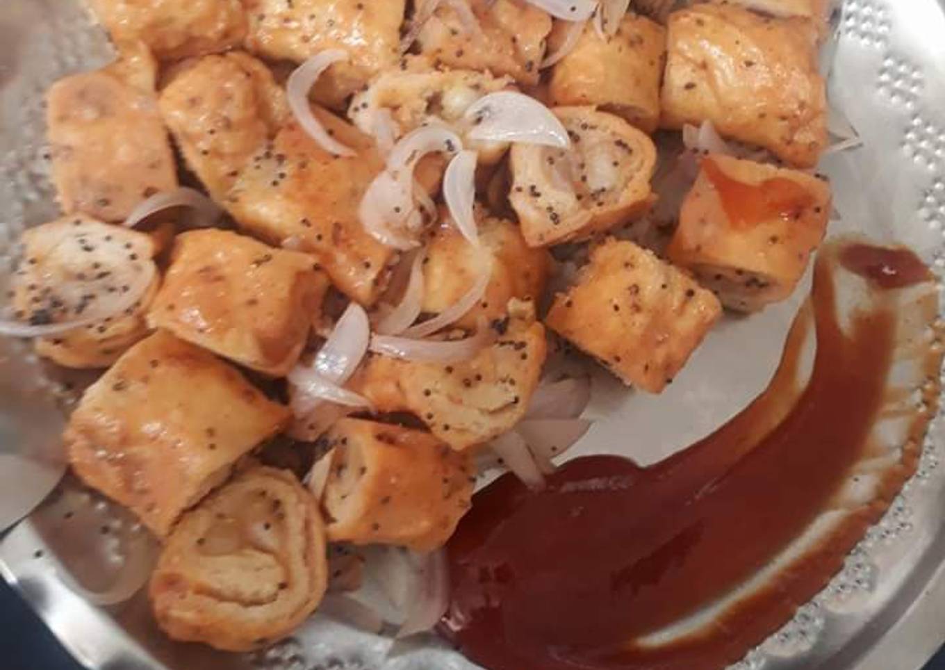 - Make a dip of besan, adding all ingredients, add bread rolls into this dip and place in छाननी (is par thoda oil laga lay)for steam, add 2 galss of water in a pan let it boiled, place छाननी and steam bread for 5-7 mints,