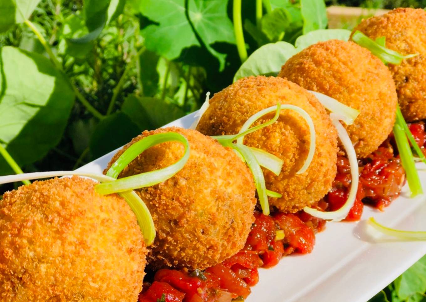 Place the tomato jam on a plate. Top with the chorizo risotto croquettes.Garnish with green onions.Serve, and enjoy!