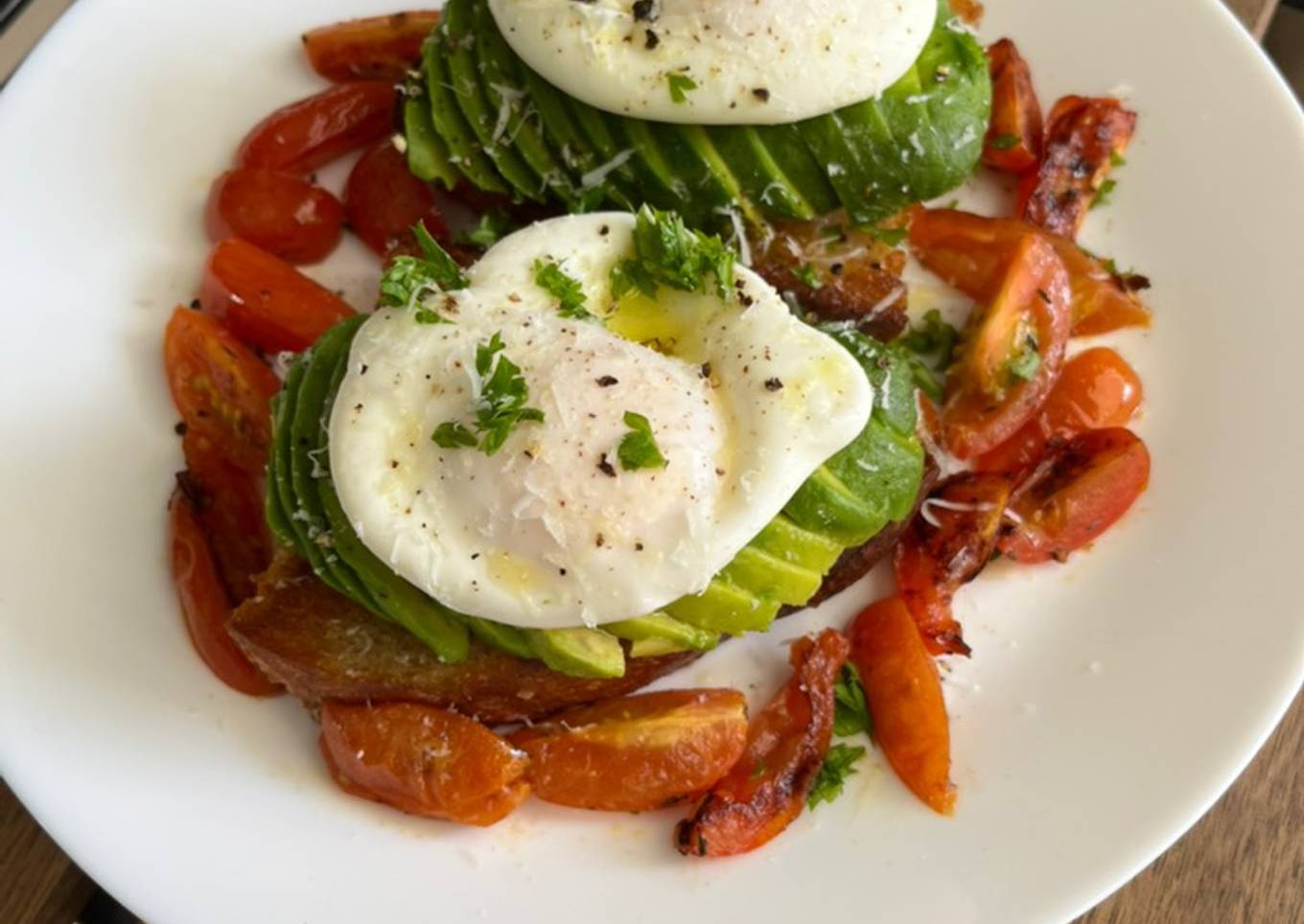 - Once the eggs are cooked, you can start assembling the dish. On each slice of bread, place the sliced avocado half, followed by the egg. Season it with extra virgin olive oil, salt, pepper, chopped English parsley, and parmigiano reggiano to taste. Add the tomatoes to the side.