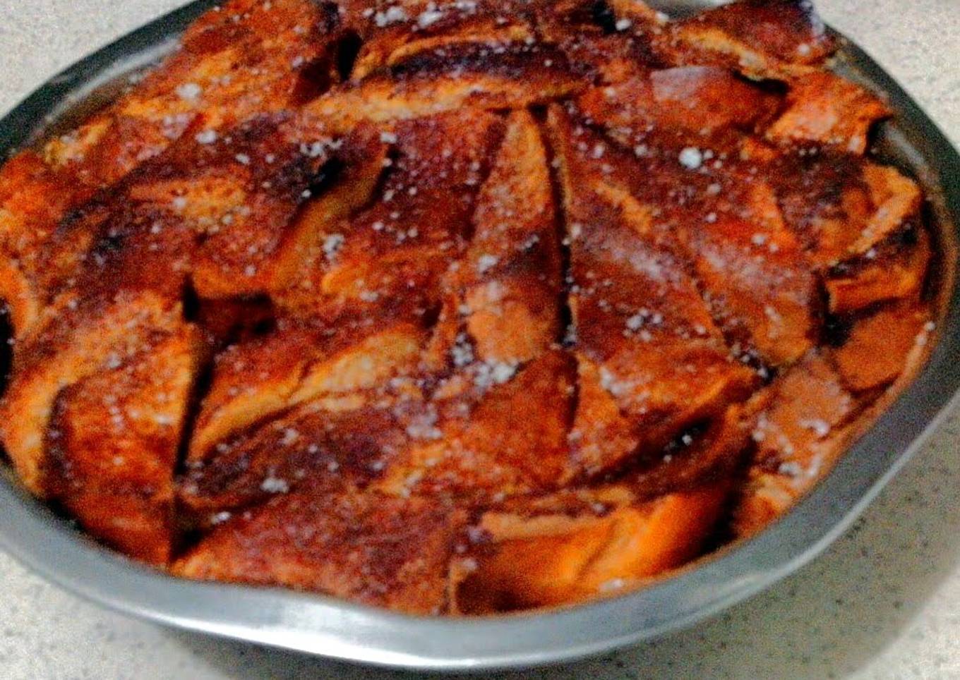 - Butter a 10 inch pan, then arrange bread to fit in the pan. Slowly pour the custard mixture to soak the bread.