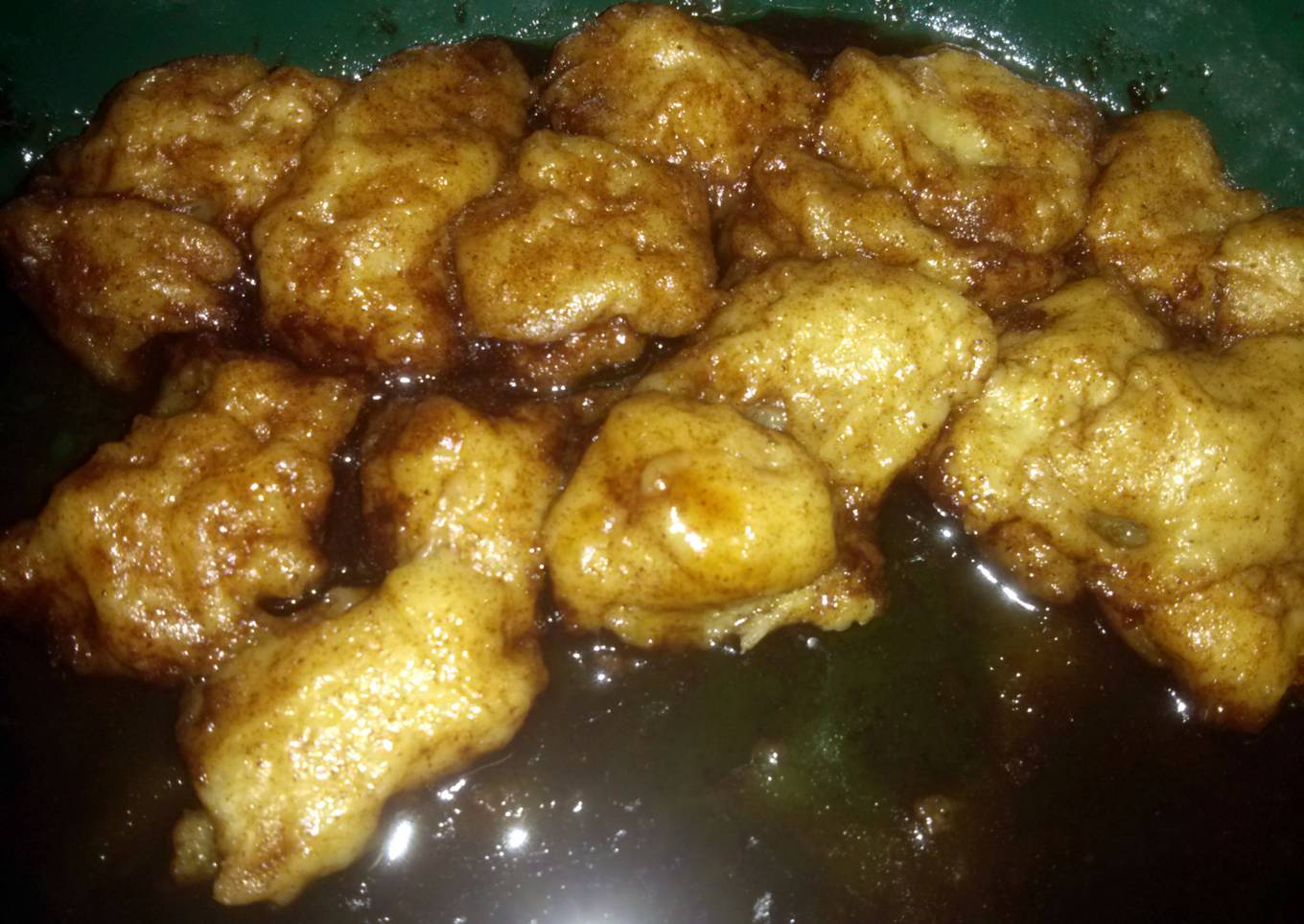 - roll each biscuit piece in the brown sugar/cinnamon combo