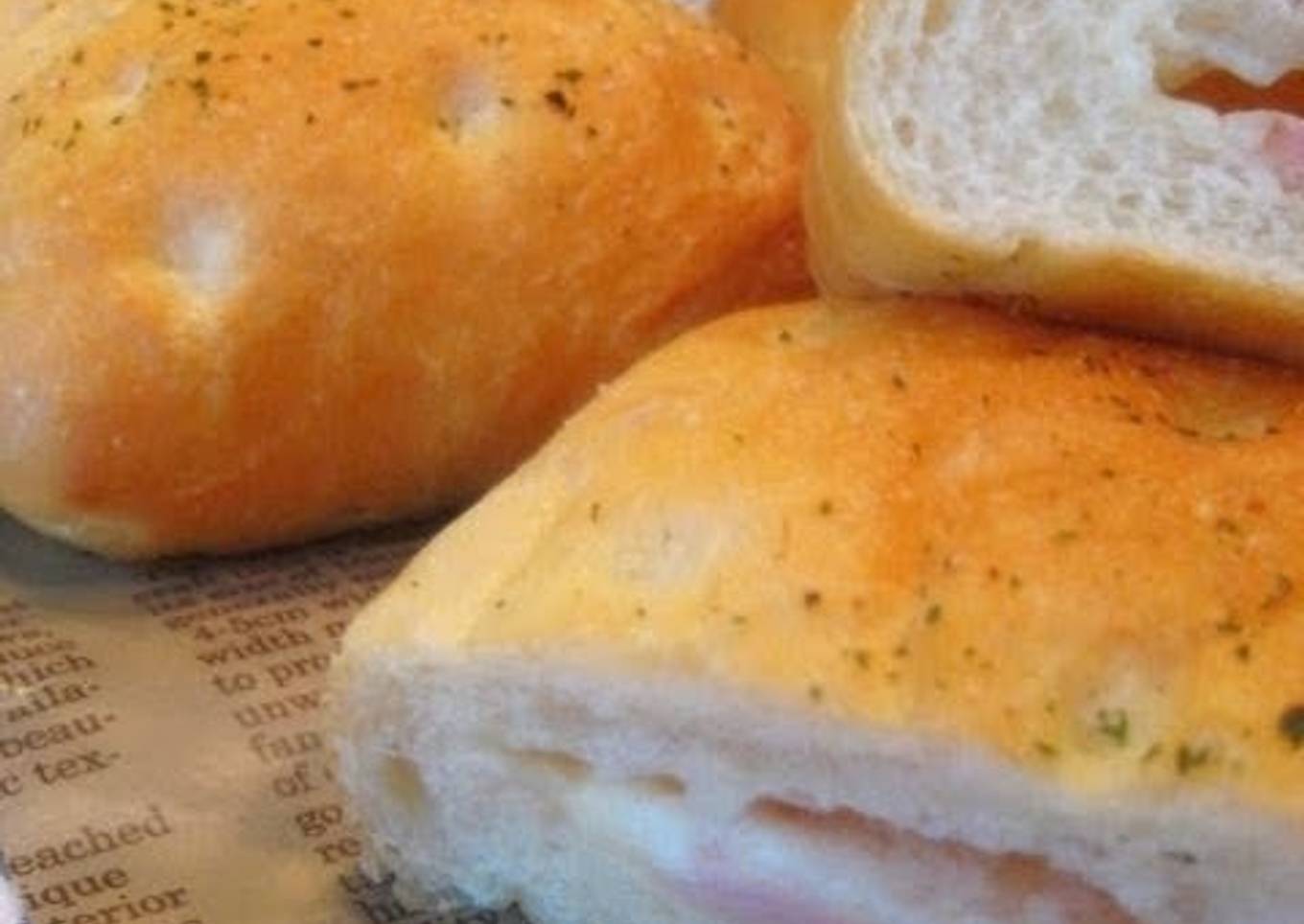 - Roll the dough out into a square, spread the middle with bechame sauce, and top with a slice each of ham and cheese folded in half. Bring the opposing corners of the dough together as shown.